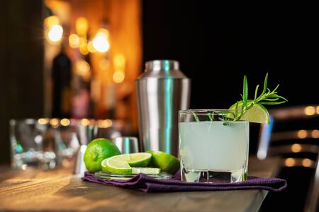 Lime cocktail with rosemary on the background of the bar. Refreshing alcoholic cocktail.
