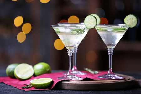 Glasses of tasty cucumber martini on table in bar