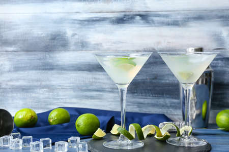 Glasses of tasty martini cocktail on table