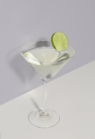 Glass of martini with lime on light background