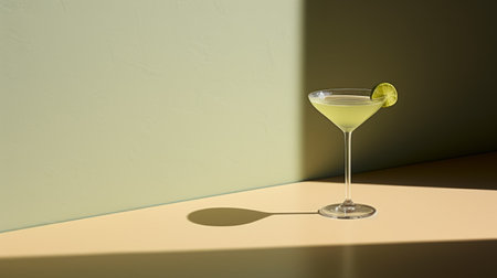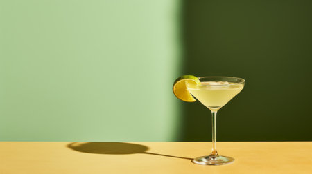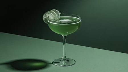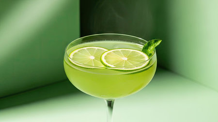 A refreshing cocktail is presented in a sophisticated glass, featuring vibrant lime slices. The drink's green hue contrasts with the soft, green-toned backdrop. The composition showcases a close-up perspective and studio lighting, suitable for culinary, lifestyle, and beverage advertising, as well as editorial content.