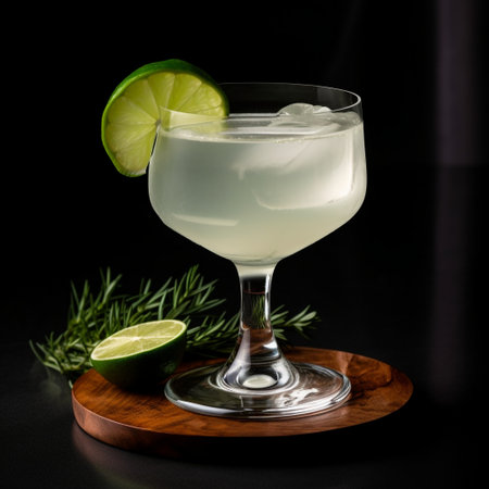Macrography, a tantalizing margarita is captured in a glass garnished with a vibrant lime slice, all set against a captivating black background. Each close-up shot of cocktail and lime. Comestible.