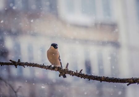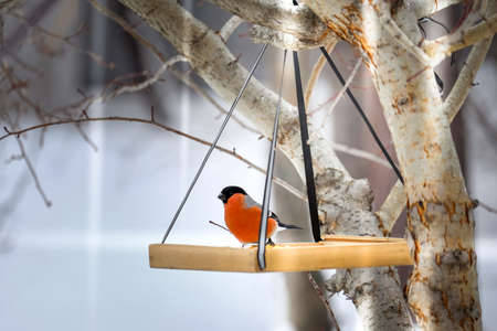 Bullfinch sits on a tree branch. Help the birds in winter. Feeding of birds. Beautiful orange male bullfinch.