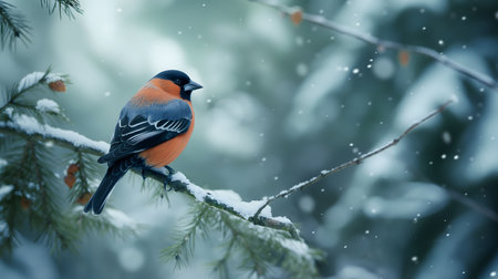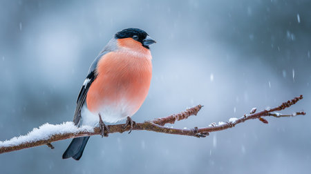 A bullfinch sits on a snowy branch, surrounded by softly falling snowflakes. The serene winter highlights its striking orange and black plumage against a blurred background.
