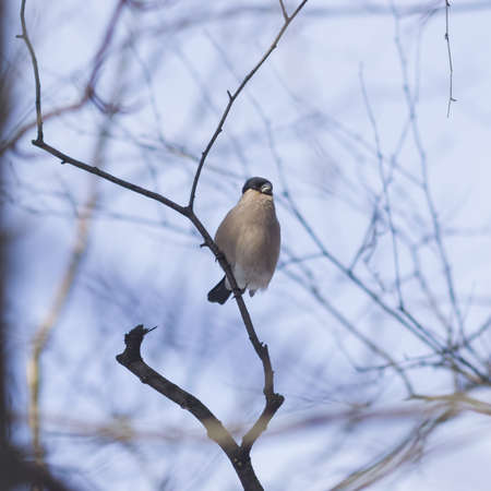 beautiful small bird common bullfinch or Eurasian bullfinch (Pyrrhula pyrrhula) bird sitting on the tree branch in winter garden