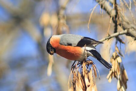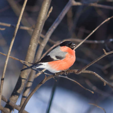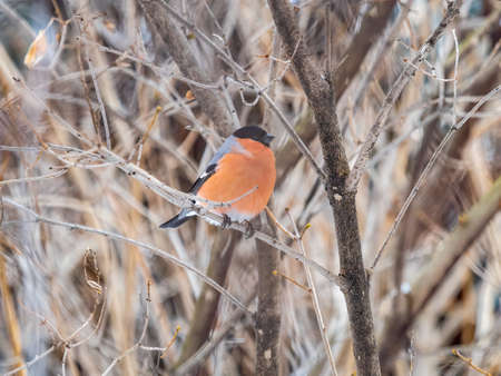 Pyrrhula pyrrhula. Male bullfinch in March in the Altai territory of Russia