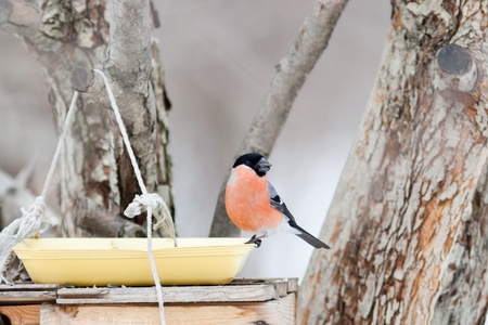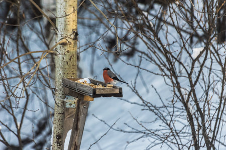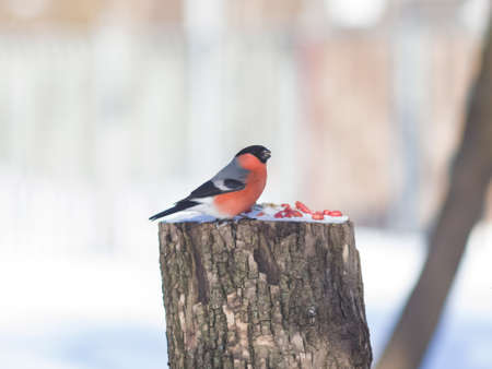 Bullfinch in winter sits on a wooden feeder