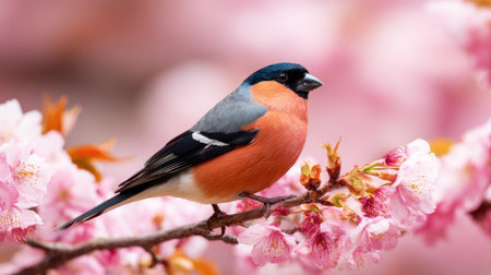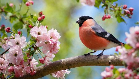 male eurasian bullfinch pyrrhula pyrrhula on a branch with pink flowers on a beautiful day in may