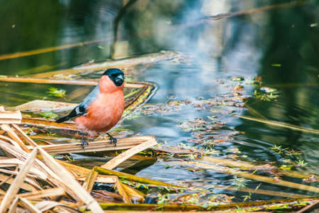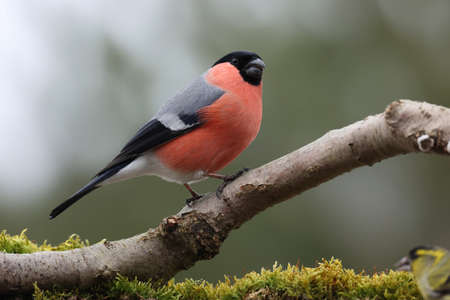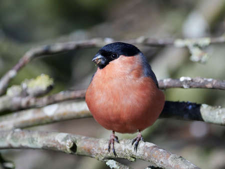 Pyrrhula pyrrhula, Bullfinch. Wild bird in a natural habitat. Wildlife Photography. Botanical Garden of Academy of Sciences, Moscow. Russia.