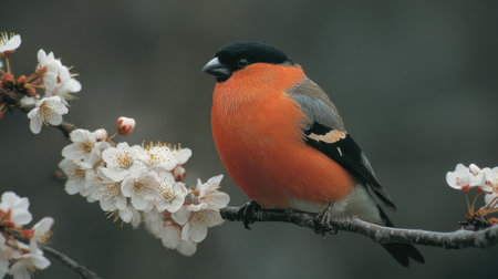 Detailed close-up of a colorful bullfinch perched on a branch laden with delicate white blossoms. The bird's plumage is a striking mix of orange-red, gray, and black. The blossoms are in sharp focus, contrasting with the blurred background.