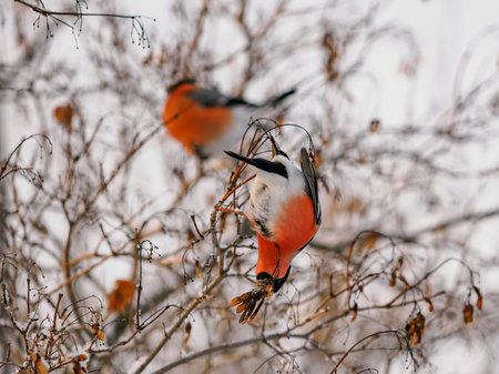 close-up bullfinches on branches of maple and rowan winter February day