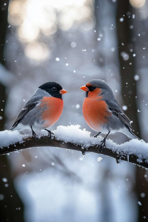 two birds bullfinches sitting on a tree branch in the forest in winter, it's snowing. generated by ai