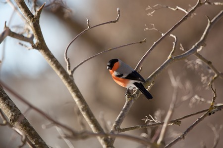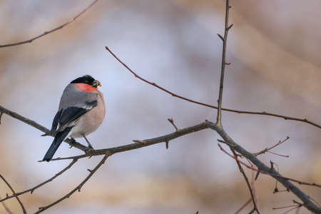 Bullfinch sitting on a branch without leaves in the autumn or winter. The Eurasian or common bullfinch, pyrrhula pyrrhula