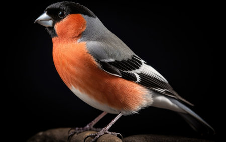 This image features a close-up of a bullfinch bird, characterized by its vibrant orange breast and gray wings. The bird has a distinctive black cap and beak. The image is set against a clean, white background, making the bird stand out prominently. This high-quality photograph is ideal for nature enthusiasts and bird watchers.