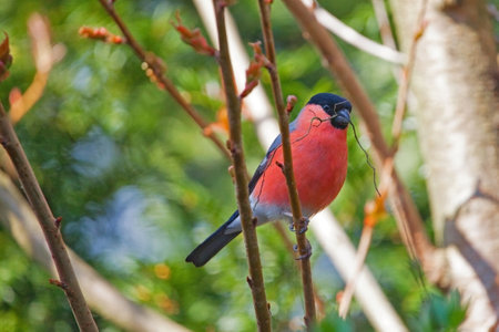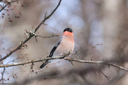 Bird bullfinch a male in tree branches with an indistinct background
