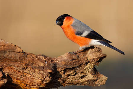 The bullfinch, common bullfinch or Eurasian bullfinch ( Pyrrhula pyrrhula) sitting on the branch with brown background