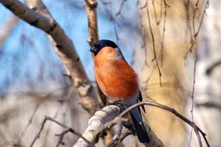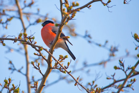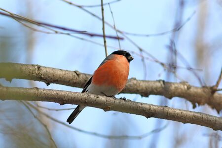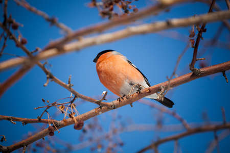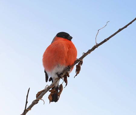 Male bullfinch sitting on a branch against the blue sky