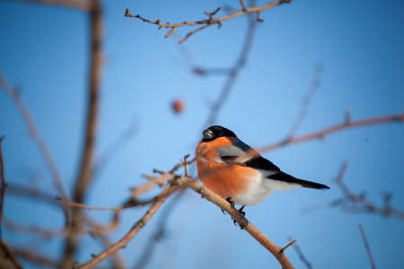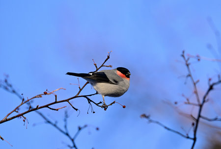 bullfinch sits on a wild apple tree and eats berries against a blue sky
