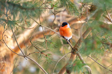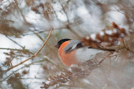 The bullfinch songbird sits on a pine branch in the winter forest.
