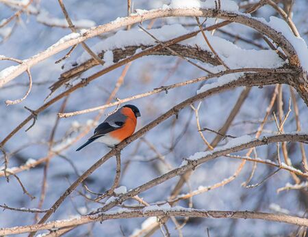 bullfinch sitting on a branch in winter,Red-bird winter migration of birds, unusual color, the bird from north