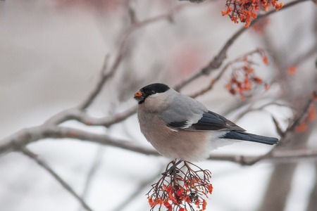 Bullfinch on rowan berry in a forest in winter