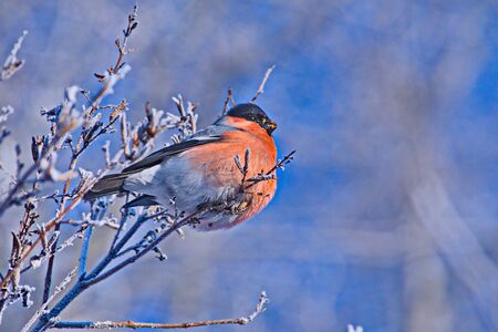 Bullfinch on a frosty sunny day. The male is a red breast. Female - gray breast