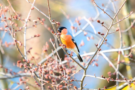 Male bullfinch on a branch of a tree in the early spring