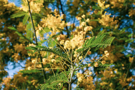 Delicate yellow flowers of Albizia lebbeck or Siris Tree or Woman's Tongue Tree close up