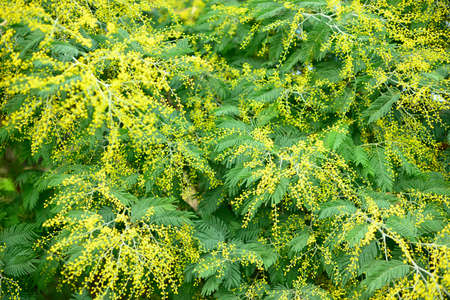Yellow acacia flowers and branches with green leaves. Natural outdoors garden park background