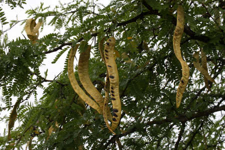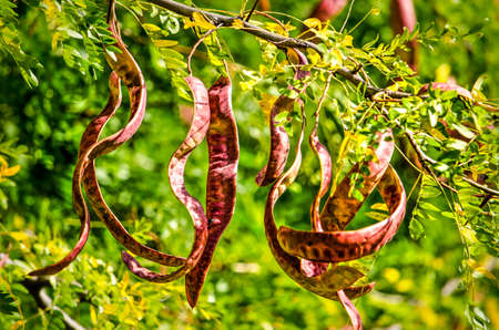 Acacia pods with seeds on a tree branch on blurred background, Italy, Tuscany region