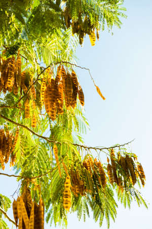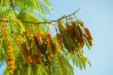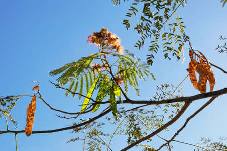 Autumn. Branch of Albizia julibrissin tree ( Persian silk tree or pink silk tree) - foliage, flowers and immature fruit against blue sky