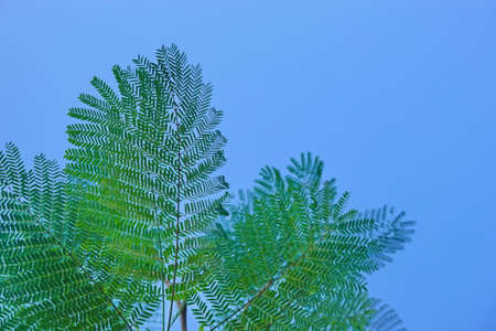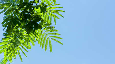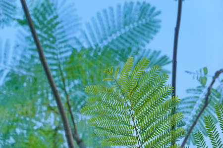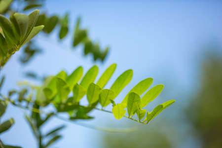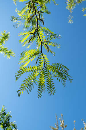 Acacia leaves on the blue sky background in summer sunshine. Selective focus on luscious green acacia leaves against a blue cloudless sky.
