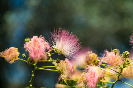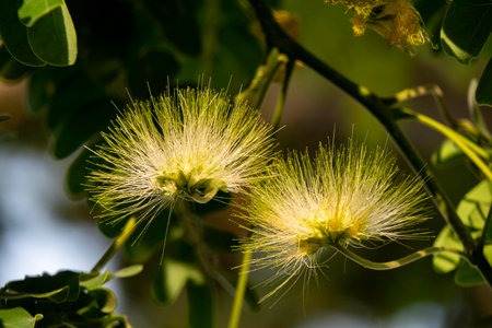 Selective focus on Flowering Persian Silk Tree against vibrant blurred background. Grey flower beans closeup with green leaves.
