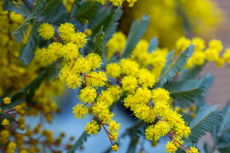beautiful mimosa branches outdoor, yellow flowers for womens day or easter