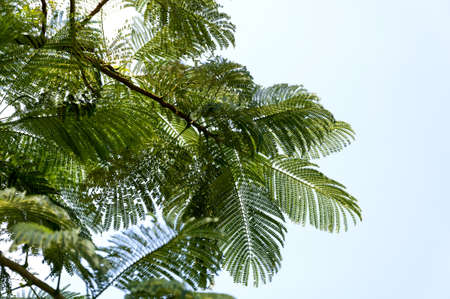 Lenkoran acacia albizia green carved leaves blue sky. Summer abstract natural background. Low depth of field with blurring. Copy space, tropical natural design. Persian tree Albizia beautiful leaves