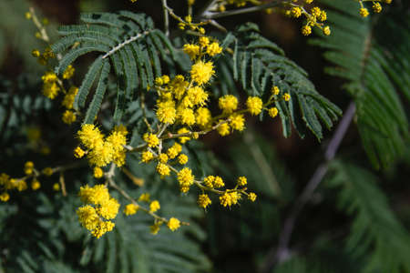 Close-up of beautiful blooming mimosa flowers in forest park.