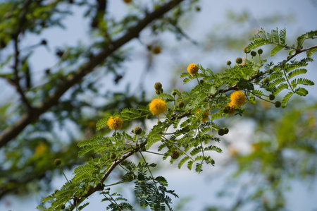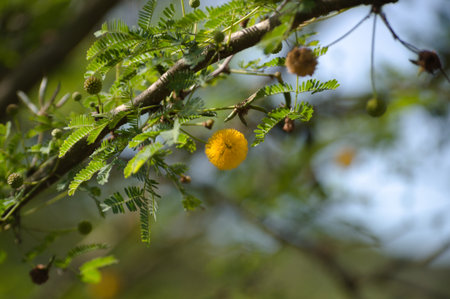 Leaves, flowers, buds and pods of the growing Vachellia farnesiana, known as acacia or sponge acacia grown in an organically