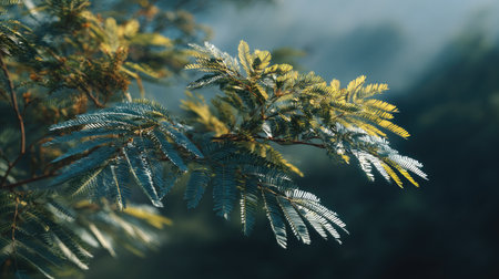 Water mimosa swaying gently in the wind, realistic photography style, bright and vivid colors, natural lighting, detailed textures on the leaves, soft motion blur to suggest wind movement, ultra realistic, high resolution, cinematic atmosphere.