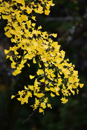 Yellow leaves of kinkgo biloba on a dark background. autumn backgrounds. Aging themes. alternative medicine.