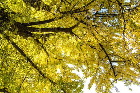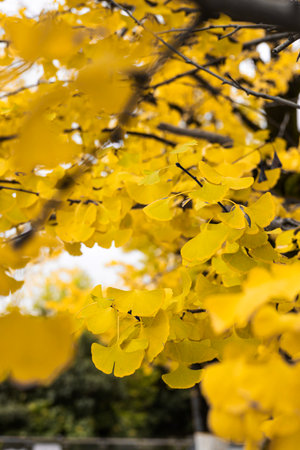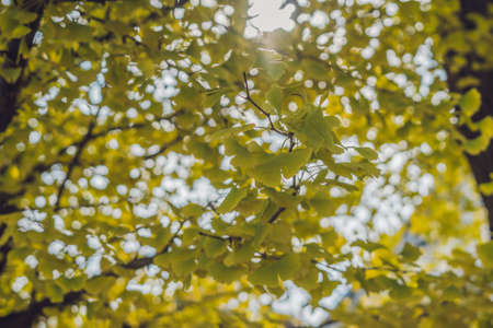 Yellow ginkgo leaves on the tree in autumn, fall season