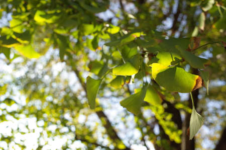 Ginkgo biloba green leaves on the tree. Ginkgo biloba tree leaves with sunbeams. healing. herbal medicine
