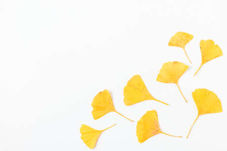 Yellow autumn leaves of Gingko biloba isolated on white background. Autumn composition. flat lay. top view with copy space