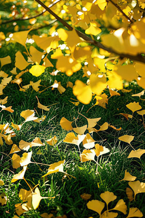 Golden ginkgo leaves scattered on the ground