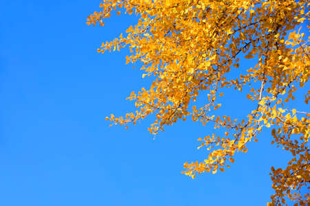 Close up yellow autumn Chinese ginkgo biloba tree leaves over blue sky, low angle view