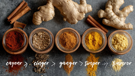 Flat lay showcases cayenne, ginger, cinnamon, and turmeric with labeled arrows, highlighting their fat-burning properties and vibrant colors.