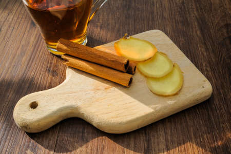 Cup of tea with ginger, and cinnamon sticks on the rustic background
