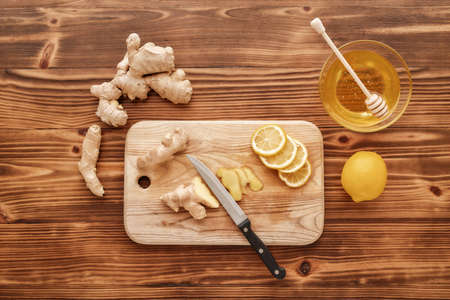 Top view of board, knife, fresh ginger, lemon, honey in a bowl with dipper on the wooden table, Preparation of cold and flu remedy cure drink