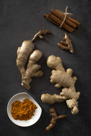 Fresh ginger roots and powder on a dark background, bright and detailed lighting