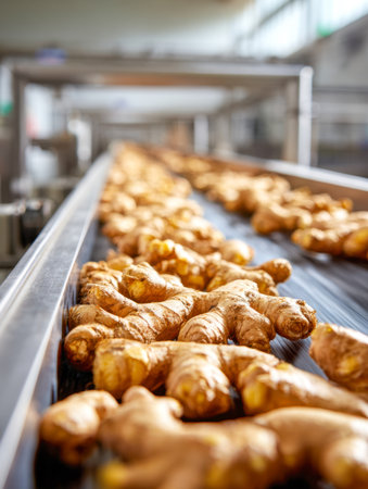 Vibrant ginger roots glide along a sleek conveyor amid shimmering stainless steel equipment, illuminated by natural light in a cutting-edge processing plant.