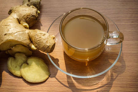 Hot Ginger juice with lemon and mint, root and slices of ginger Served with brown sugar and honey on sackcloth background. Hot ginger juice can helps warming body, Healthy Drink.